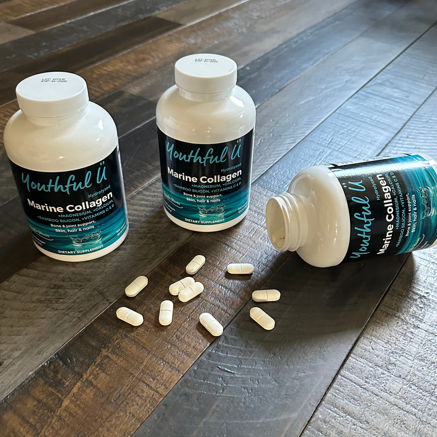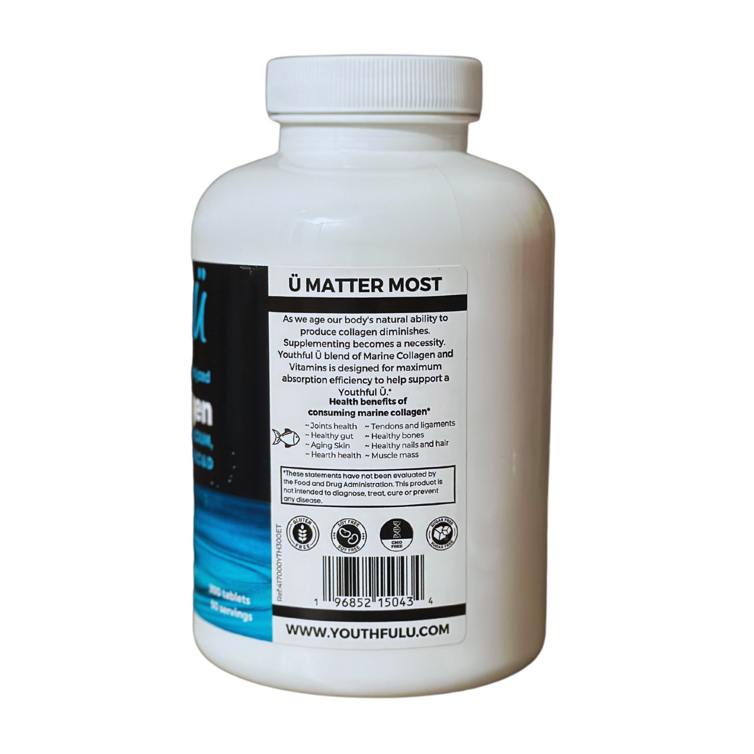 Youthful Ü unique blend of Marine Collagen with Minerals and Vitamins is designed to slow down the aging process by improving skin elasticity, hair and nails health, protecting bones, cartilage and joints, diminish tiredness and fatigue, promote gut health, all to maintain a Youthful Ü. Our blend helps achieve beauty and strength from inside out. Gluten Free, GMO Free, Sugar Free, Soy Free.**